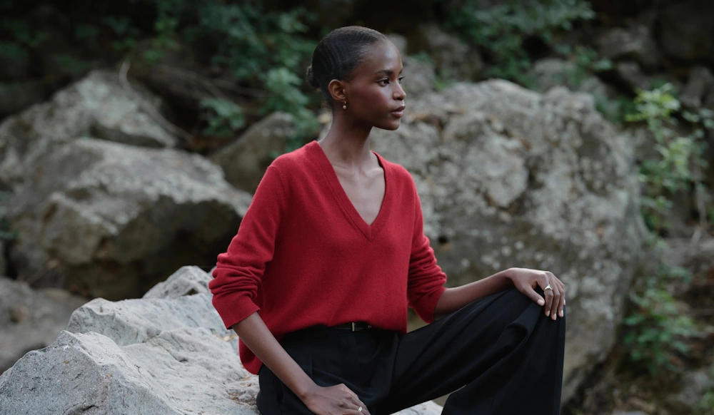 The Cashmere Cocoon Cardigan is arguably the heart of the brand. It features a relaxed, slightly oversized silhouette with a low V neckline and button front. Crafted in soft cashmere, it drapes beautifully and has that slouchy fit that feels intentionally roomy instead of baggy. The design comes in multiple colors and sizes, and there are variations in cotton and cropped cuts as well.