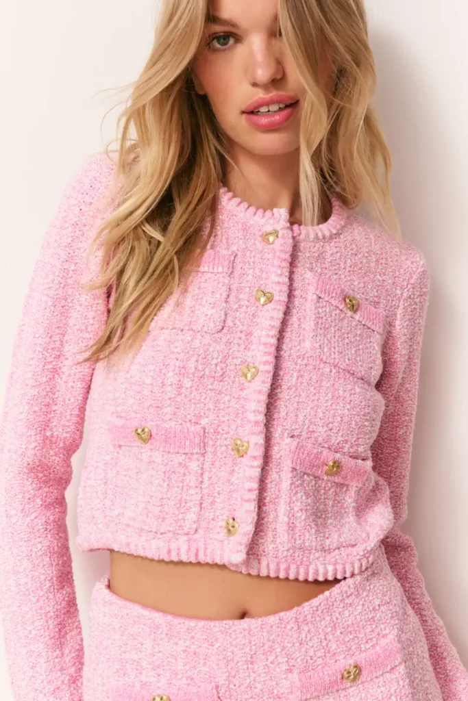 This piece brings textured bouclé fabric into the mix, with a straight-cut cropped silhouette, a clean round neckline, long sleeves, and gold heart-shaped buttons that grace the front and the four pockets (two chest, two waist).